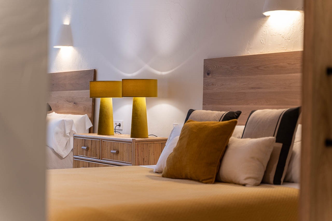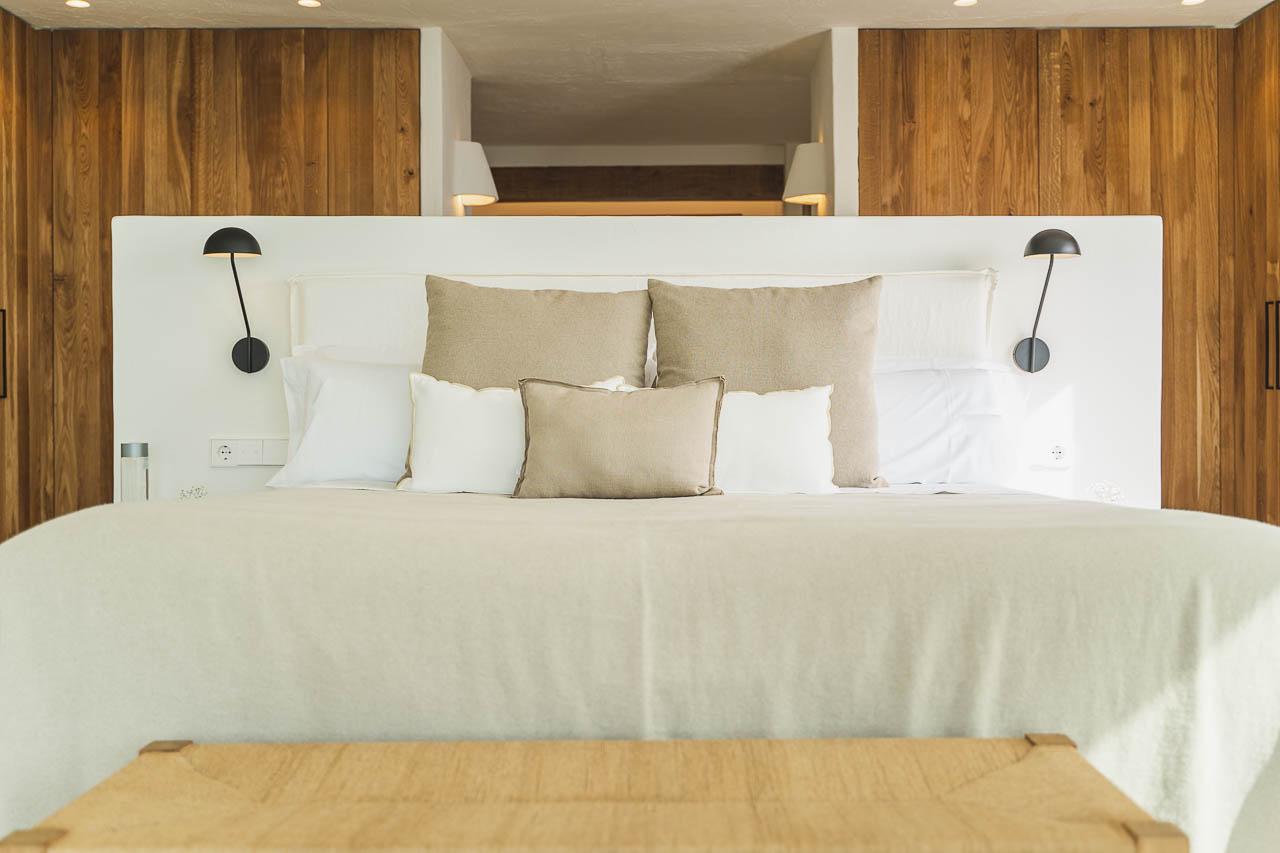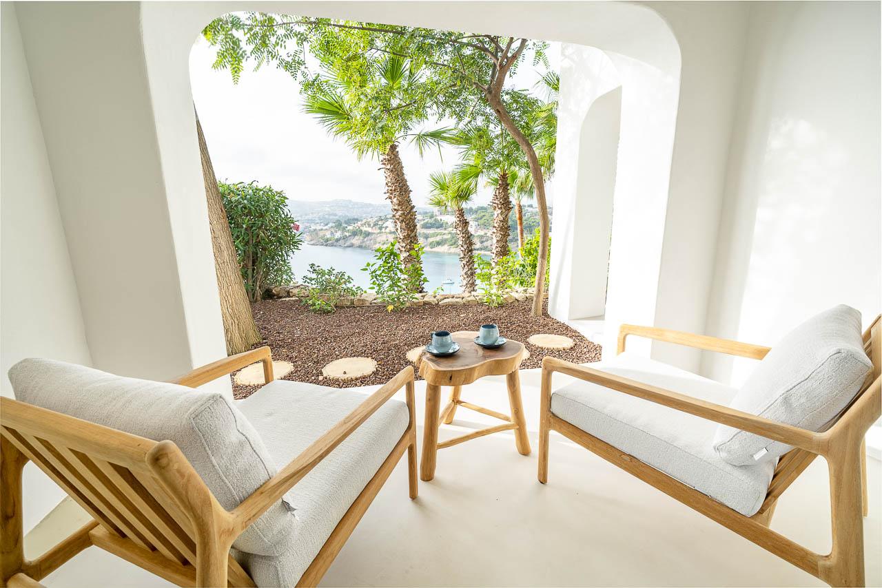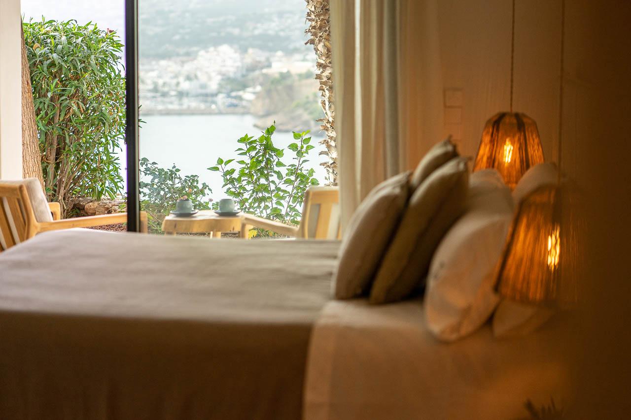 Inside, the decoration is inspired by natural materials. The vaporous curtains and the bed linen are adorned with light and soft hues, reminiscent of the blonde sand found on the beaches of Moraira.