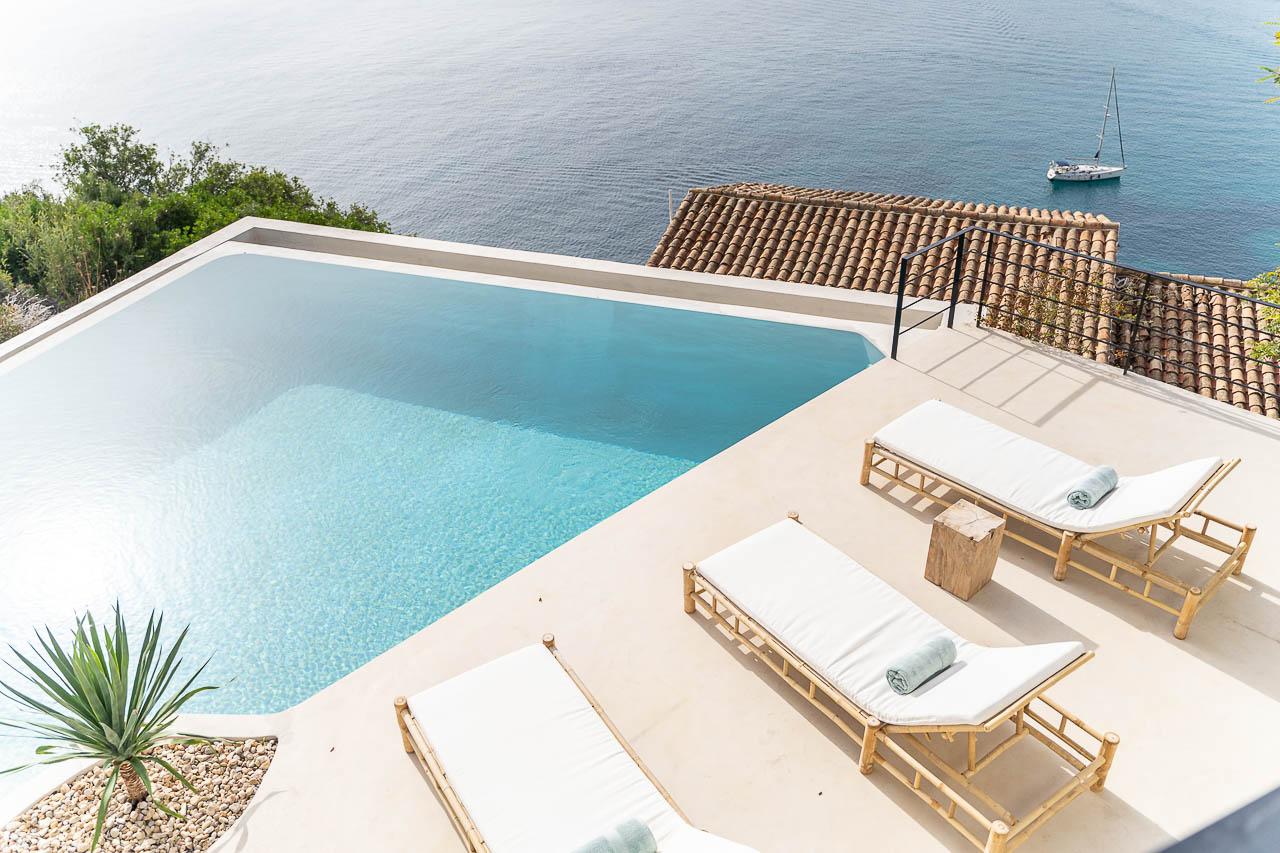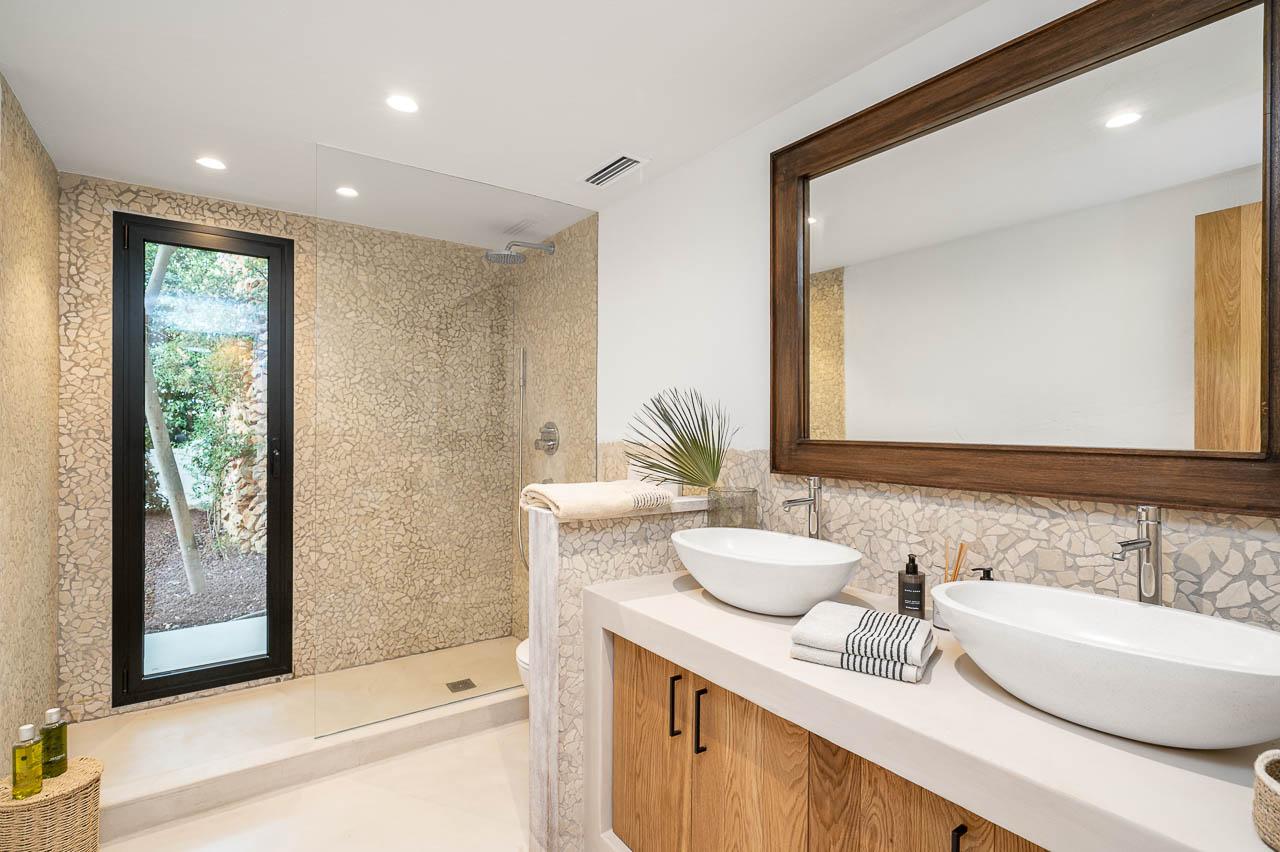 It is comprised of an air-conditioned master bedroom with a king size bed, large bay windows and views across the Mediterranean from the moment you wake up, and completed with en-suite bathroom. The bedroom on the ground floor includes two queen size beds and an en-suite bathroom. Two additional bedrooms on the lower level, one with two queen size beds, en-suite bathroom and a small terrace. The second with double bed, en-suite bathroom and terrace with sea views.