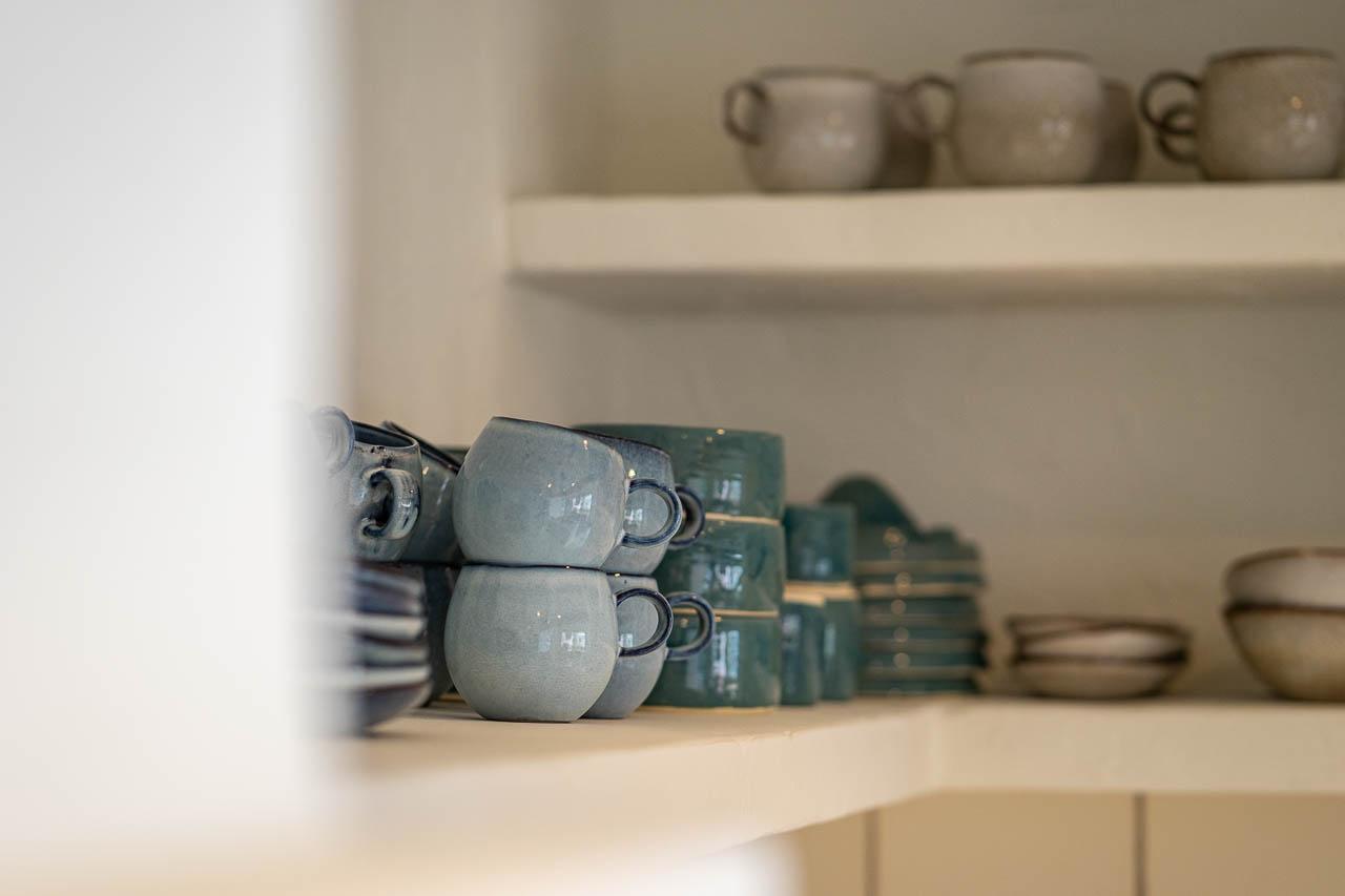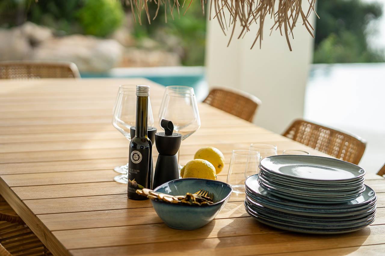 The adjoining dining room accommodates eight guests complete with sliding glass doors overlooking the terrace and the Mediterranean Sea. The adjacent, well equipped kitchen allows you to easily prepare your meals or small snacks to enjoy at the dining table or on the terrace enjoying the splendid views.