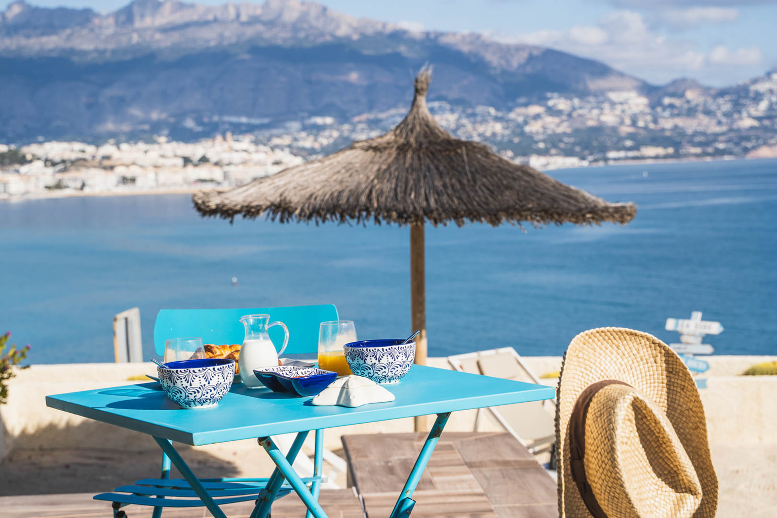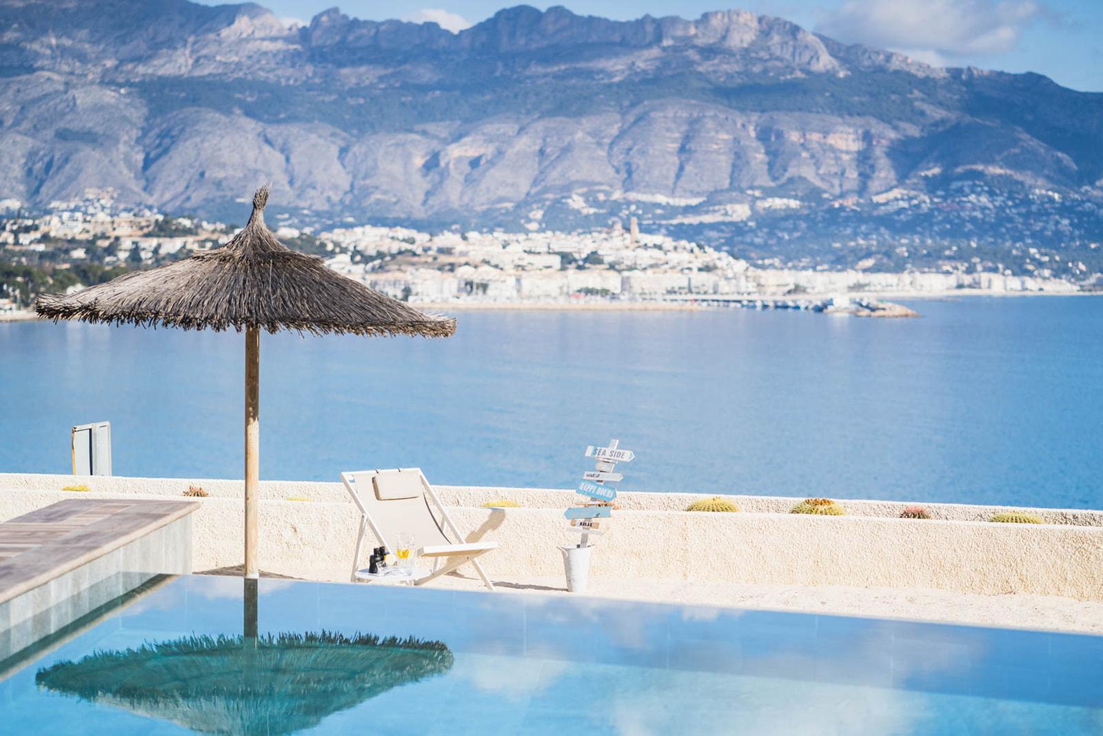En la terraza, todo ha sido pensado para unas vacaciones perfectas. El espacio está diseñado para aprovechar al máximo los espacios, arrullado por el sonido de las olas frente a la vista del mar, Altea y la Sierra de Bernia a lo lejos. Tumbonas y sofás abrigados les esperan para disfrutar de la belleza de los elementos y contemplar el cielo estrellado cada atardecer. Una hermosa piscina y una ducha al aire libre aportan relajación y frescura a este entorno idílico.