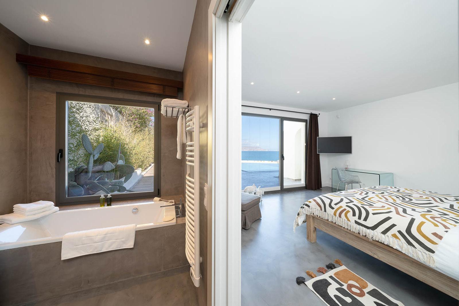 Cama King size, Baño en suite con, ducha, Bañera, Vestidor, Aire acondicionado, TV, Acceso a la terraza con la piscina.